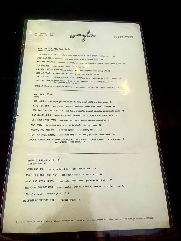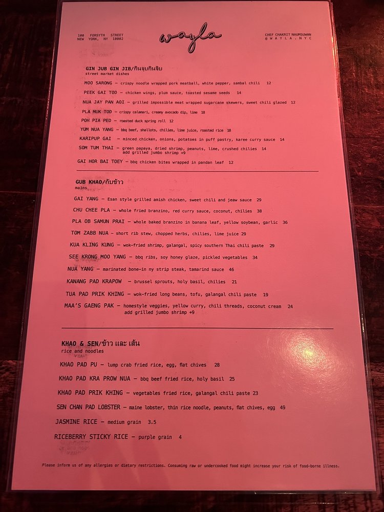 Introducing Wayla, a trendy and upscale Thai restaurant located in New York City. This hidden gem offers a mix of traditional and innovative dishes, with options for vegans and limited vegetarians. The menu includes delectable items like Fried Calamari with avocado dip, Chicken Wings glazed with plum sauce, and flavorful Wok-Fried dishes like long beans with tofu. Customers rave about the generous portions and delicious cocktails, making it a must-visit spot. Reviews highlight the immersive flavors, helpful service, and unique ambiance. Standout dishes include the Yellow Vegetable Curry and Lobster Pad Thai, providing a mix of sweet and savory flavors. While some dishes may need more protein, the overall experience at Wayla is perfect for a fun night out with friends or family.